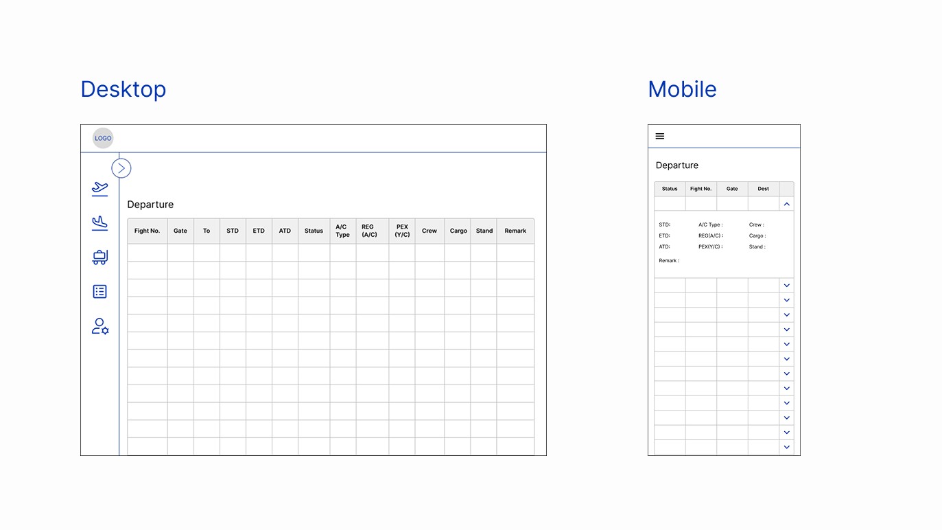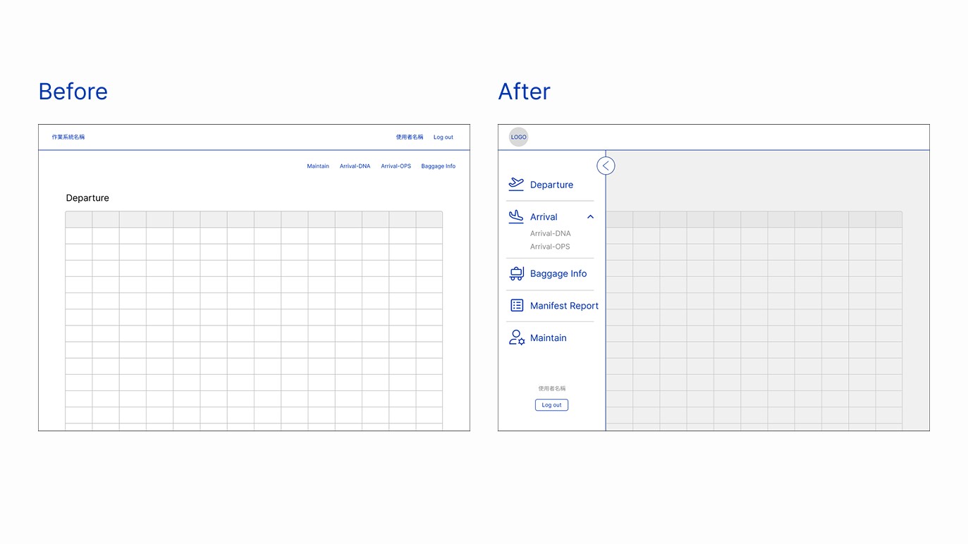 設計細節: 考量到地勤人員需長時間處理高密度數據,設計了可收合式選單以最大化表格閱讀空間。